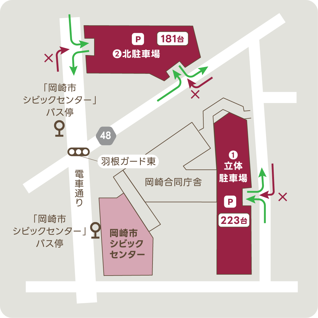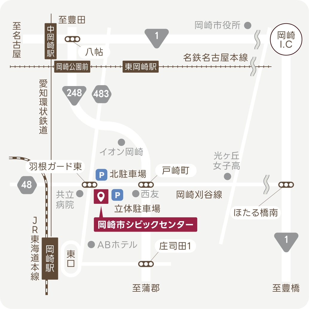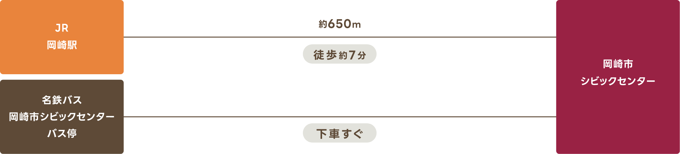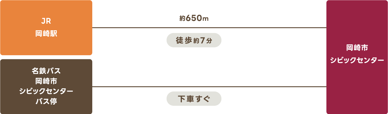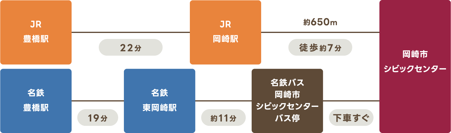 名鉄豊橋駅から名鉄東岡崎駅まで約19分、名鉄東岡崎駅より名鉄バス「岡崎市シビックセンター」下車