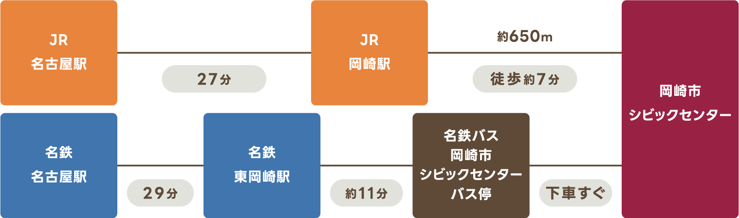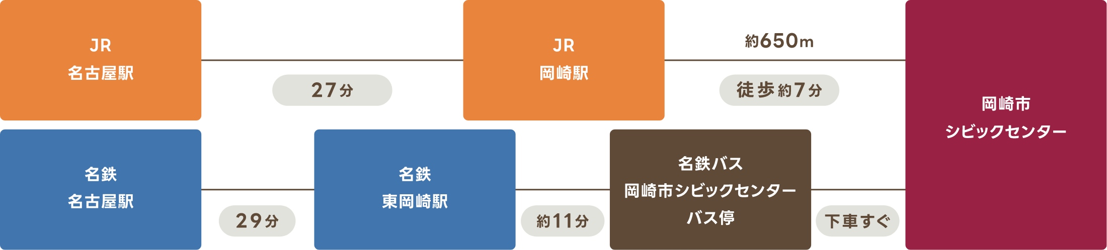 名鉄名古屋駅から名鉄東岡崎駅まで約29分、名鉄東岡崎駅より名鉄バス「岡崎市シビックセンター」下車