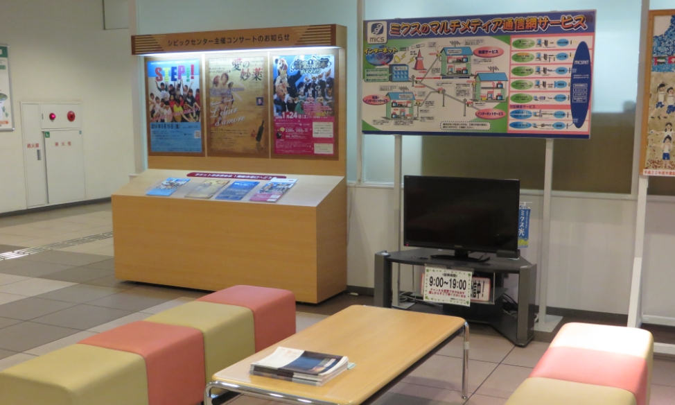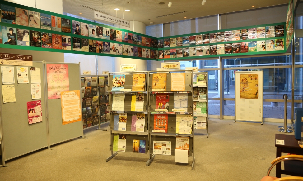 シビックセンター主催公演情報やアンサンブル天下統一に関する展示のほか、市内・県内を中心に音楽に関連するイベントのチラシを設置しています。また、音楽サークルの活動告知やメンバー募集などができるコミュニケーションボードも設置しています。(貸施設利用者のみ)